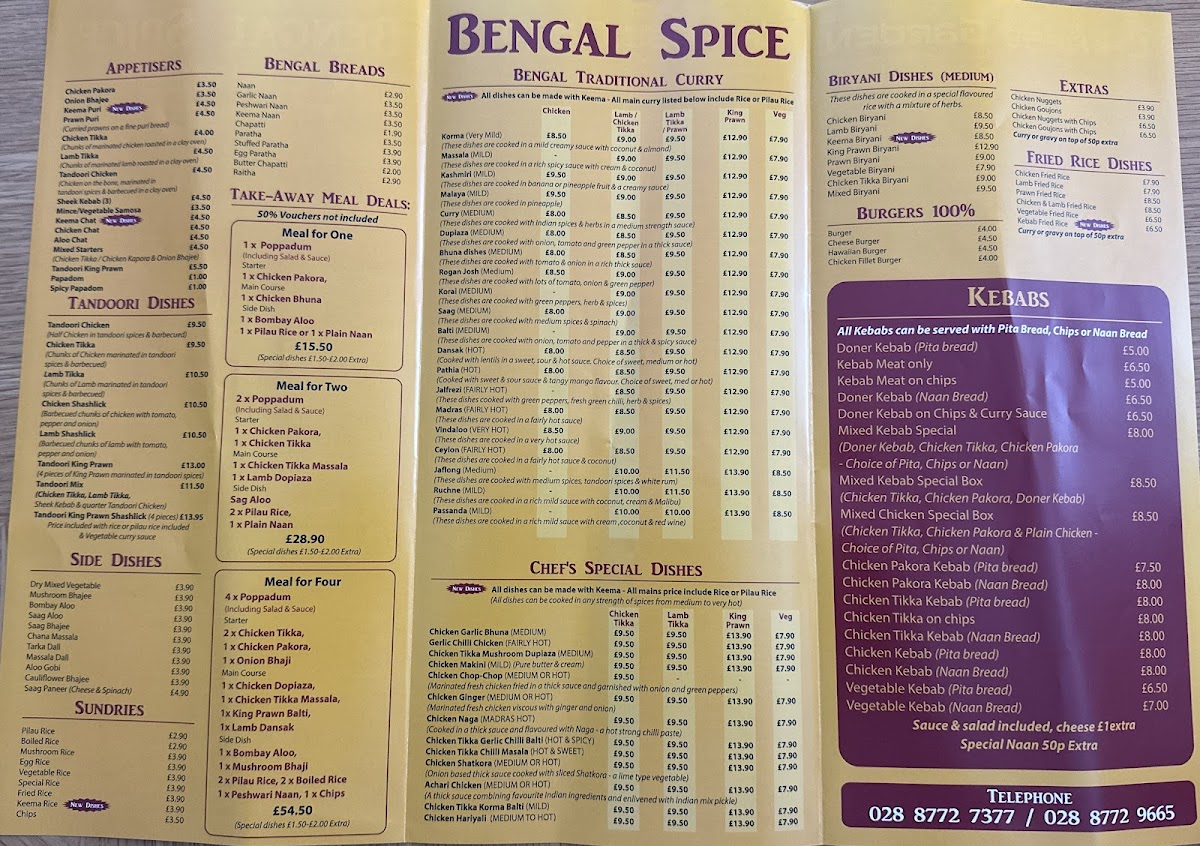 Bengal Spice Indian Restaurant & Takeaway offers a diverse and enticing menu that showcases a blend of traditional Indian flavors with some creative twists. One standout dish is the Chef Special Fried Doner Kebab, a unique take on the classic kebab, fried to perfection with a rich blend of spices. Another favorite is the Chicken Tikka Kebab on Naan, combining succulent chicken tikka with soft, fluffy naan, making it a satisfying and hearty meal. For those looking to enjoy a refreshing drink alongside their meal, the restaurant also offers Budweiser, a perfect pairing for the vibrant dishes. Whether you're craving a flavorful kebab or something more traditional, Bengal Spice’s menu provides something for everyone, with a variety of choices to suit all tastes.